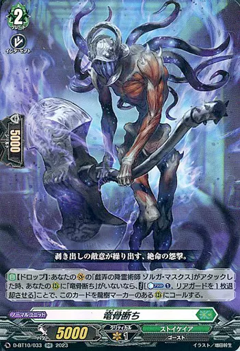 【自】【手札/ドロップ】:ゾルガを含み、ディヴァインスキルを持つあなたのヴァンガードがアタックした時、このカードと同名のあなたのリアガードがいないなら、コスト【カウンターブラスト1】することで、このカードをRにコールし、あなたのバインドゾーンのノーマルオーダー1種類につき、そのターン中、パワー+5000。