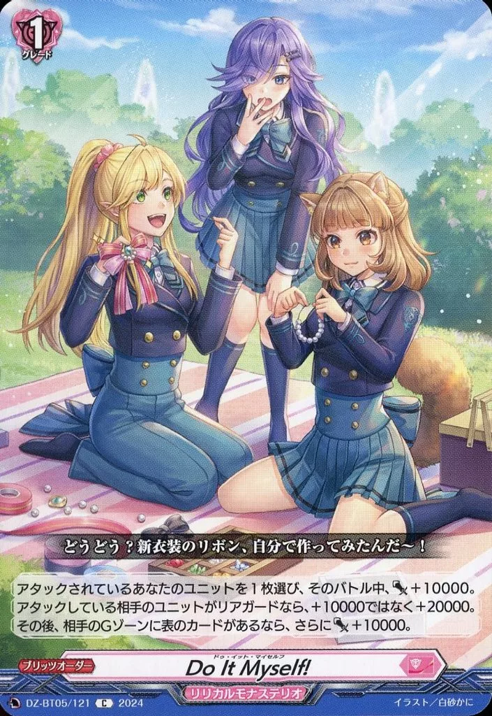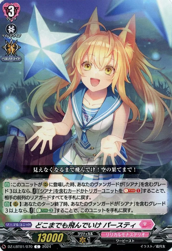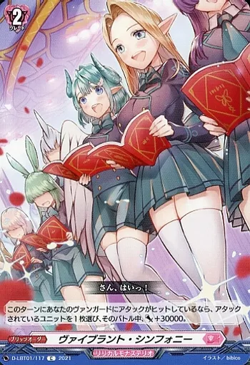 旧シアナからライドして登場した時に、山札の上5枚から守護者以外のノーマルユニットを1枚コールか、ブリッツオーダー1枚を回収。