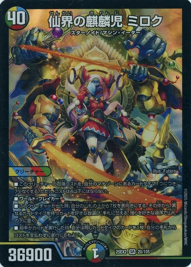 「仙界の麒麟児 ミロク」は40マナのクリーチャーですが、マナゾーンにあるカードタイプの数だけコストが7減っていきます。