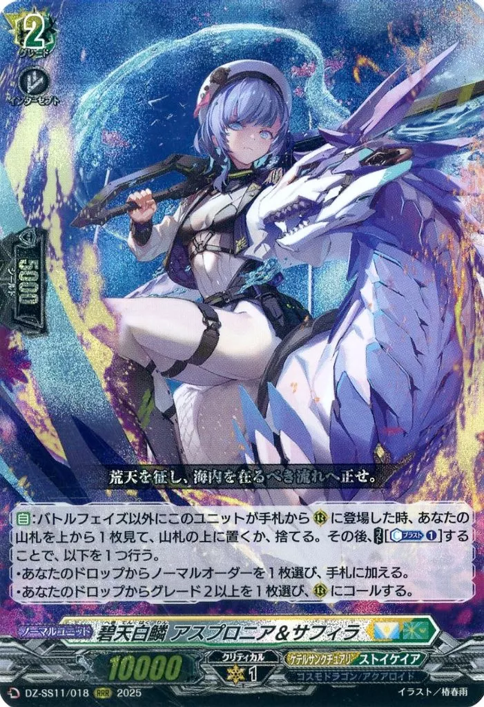 起動効果でエネルギーブラスト2使ってドロップから1体コールと、自身のアタックしたバトル終了時に、リア2体退却とカウンターブラスト1でドロップからレグルレグナス・アザナシオスにライドする効果を持っています。